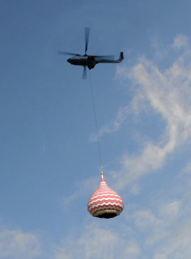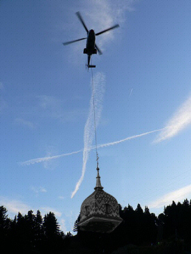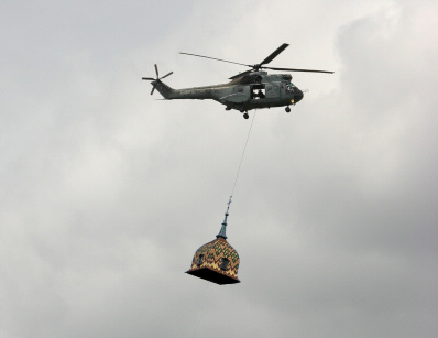 Les clochers sont hélitreuillés un beau soir et s'envolent vers leur nouvelle destination. |