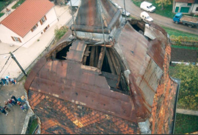 | Le clocher était en piteux état avant la restauration... | ...et la charpente très abîmée | |