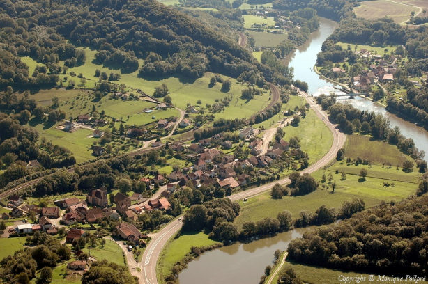 | Le site de Hyèvre-Paroisse dans la vallée du Doubs, photo M. Poilpré 15 juin 2008 | La commune de Hyèvre-Paroisse vue du ciel, photo C. Fontana mai 2012