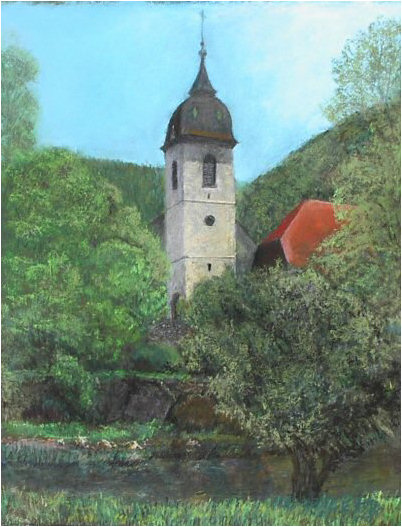 | Ci-dessous le clocher de Saint-Hippolyte Pastel de Jean Patrice Dalem 2005 |